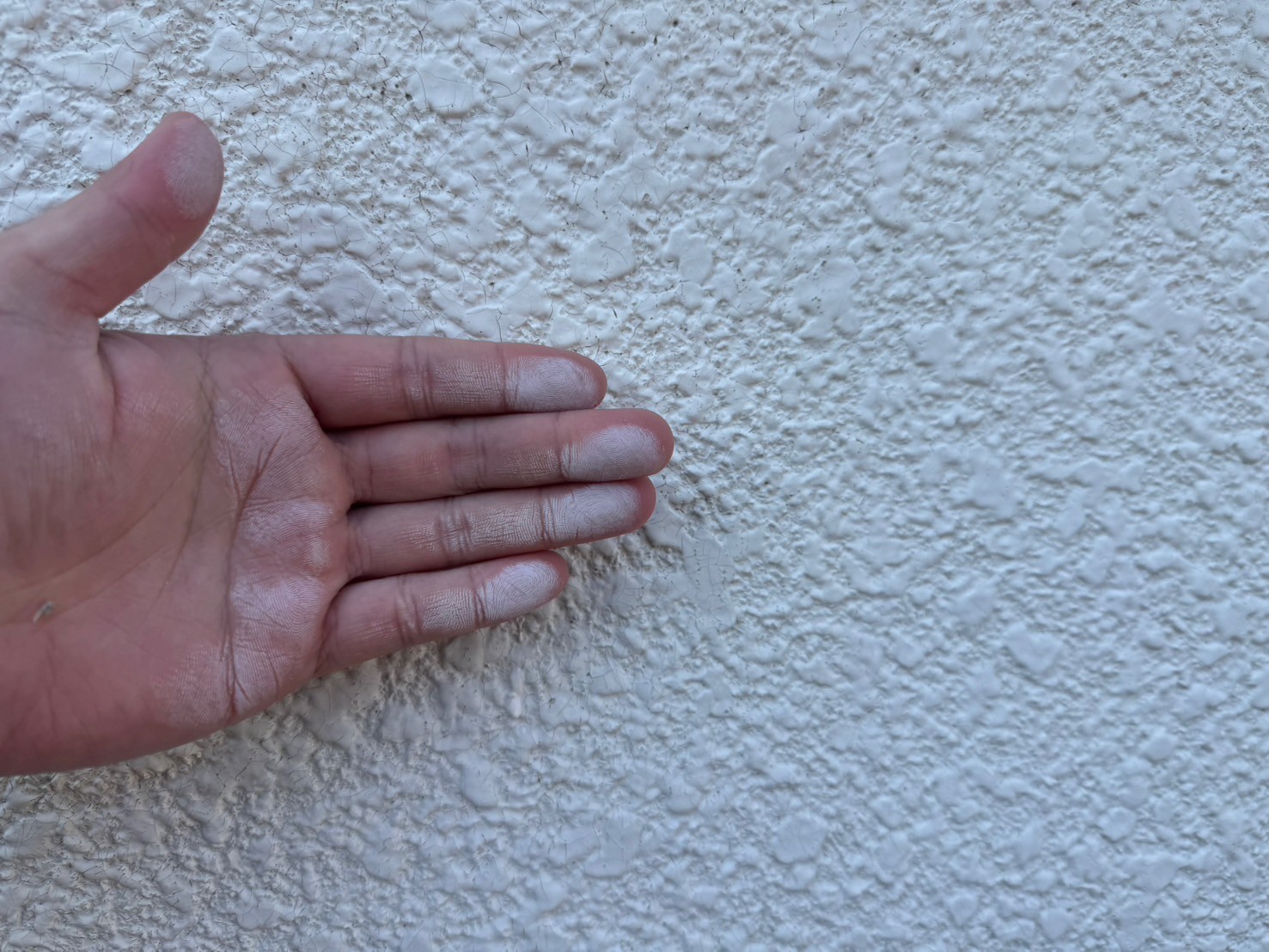 紫外線や風雨によって塗膜中の樹脂が分解され顔料が表面に浮き出た劣化症状であり、