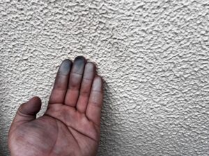 表面に白い粉状の顔料が浮き出る症状で、塗膜の防水性・密着性の低下を示すため、