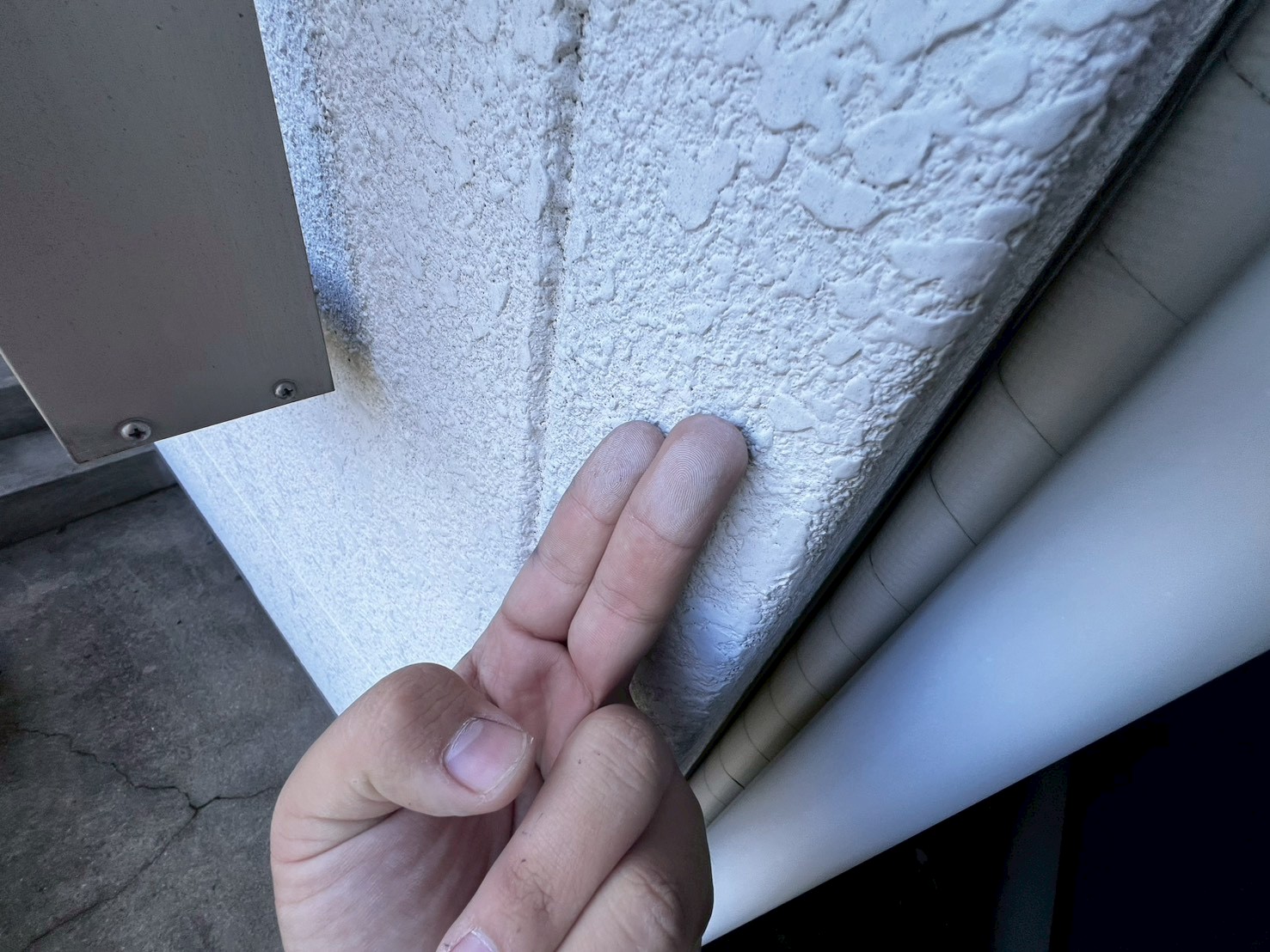 表面に白い粉状の顔料が浮き出る症状で、塗膜の防水性・密着性の低下を示すため、