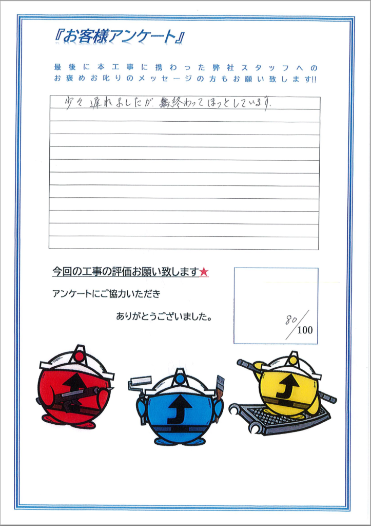 工事期間も天候などにより当初の日程より遅れてしまったのですが寛大な御心で受けっとて頂き本当にありがとうございました。